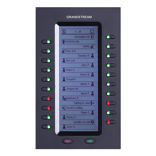 The GXP2200EXT module features a large 128 x 384 graphic LCD and 20 programmable buttons (each with dual color LED). In addition, this Grandstream Expansion Module allows up to 40 extensions per module by using the 2 page switch keys and up to 160 buttons when 4 extension modules are daisy-chained together with the power being supplied and controlled by the base phone.